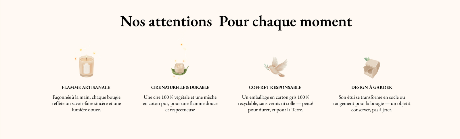 123456Nos ChoixQuatre univers pour composer le rituel qui vous ressemble, bougie après bougie.Du coffret découverte aux petits accessoires, tout pour sublimer vos moments bougie.